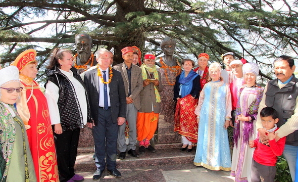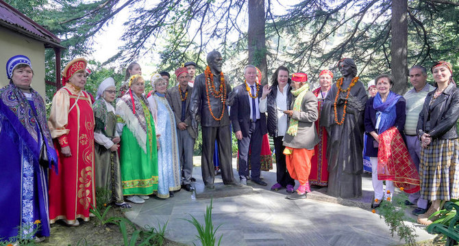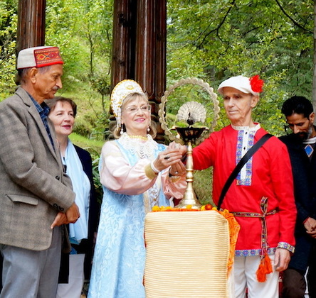 По завершении церемонии поднятия флагов гости и организаторы, ведомые уважаемым пуджари, совершили почетный обход, возложив гирлянды из бархатцев на скульптуры именинника Святослава Рериха и его жены, Девики Рани, а также на бронзовые бюсты родителей, Николая Константиновича и Елены Ивановны.