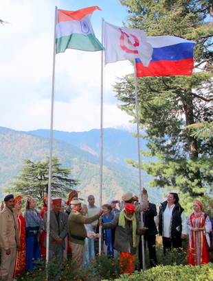Символическое единение культур, заложенное в самом духе Усадьбы Рерихов, нашло свое яркое отражение и в важной церемонии поднятия трех флагов: Индии, России и Знамени Мира. Поднятие национальных флагов Индии и России во время Рериховских фестивалей в ММТР олицетворяет глубокие и многолетние культурные и духовные связи между двумя странами, подчеркивая особый статус мемориальной Усадьбы в Наггаре как российско-индийского культурного центра, основанного на идеях семьи Рерихов, и подтверждая приверженность обеих сторон делу сохранения и развития этого наследия. Тогда как поднятие Знамени Мира — отличительного знака Пакта Рериха, с его символом триединства, является мощным визуальным манифестом универсальной идеи Культуры как краеугольного камня цивилизации и мира. В контексте юбилейного года Пакта Рериха этот акт приобрел особое, планетарное значение, утверждая, что сотрудничество и защита красоты и культуры являются единственным путем к прочному миру. Символично, что церемонию благословил уважаемый пуджари Шри Джайдев Ачарья.