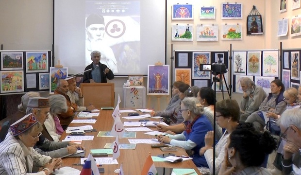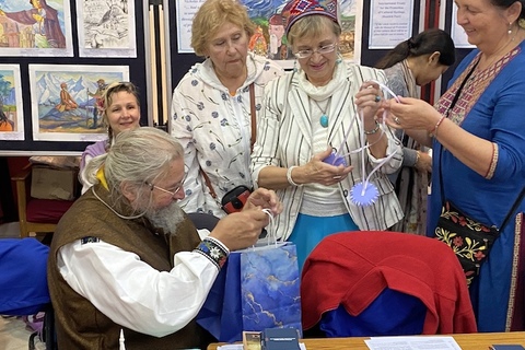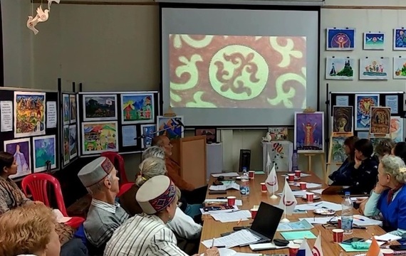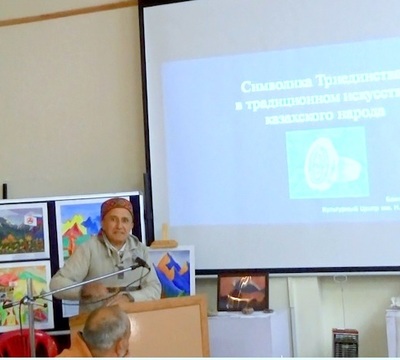 Далее вниманию слушателей был представлен глубокий культурологический анализ, посвященный связи идей Рериха с историческим прошлым человечества. С докладом «Символика Знамени Мира в традиционном искусстве Казахстана» выступила Наталия Баженова, заместитель руководителя Культурного Центра имени Н.К.Рериха, руководитель Отдела прикладного искусства Казахского ГМИ РК им. А. Кастеева и Член Союза художников Республики Казахстан. Ее выступлению предшествовало вдохновляющее вступительное слово Вадима Ханифовича Ахтямова, члена Культурного Центра имени Н.К. Рериха и председателя Алматинского Фонда поддержки культуры «Сердце Азии». В своем обращении Вадим Ханифович подчеркнул не только глобальное эволюционное значение Пакта Рериха, но и его исключительную важность в предотвращении международных конфликтов. Особо отметив, что 2025 год ознаменован 80-летием Победы в Великой Отечественной войне, он напомнил о героическом вкладе казахского народа в эту священную Победу. Выступающий тепло пригласил всех присутствующих посетить Казахстан – страну с богатейшим духовным наследием, традиционной культуре которой и был посвящен доклад Наталии Баженовой. После такого глубокого и вдохновляющего вступления аудитория была готова погрузиться в мир древних казахских символов, где наследие Рериха обретает яркое и осязаемое воплощение.