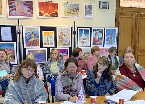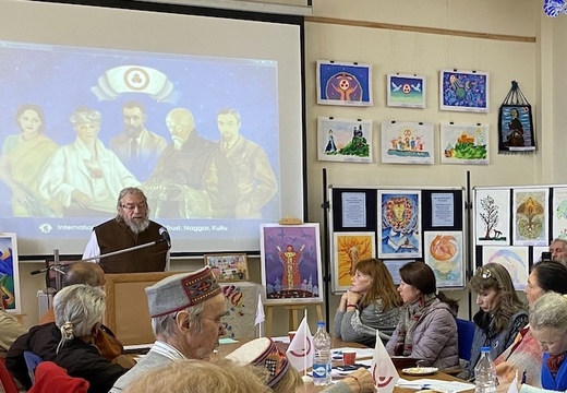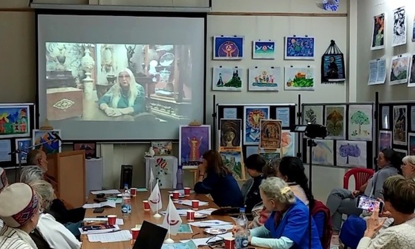 Надежда Викторовна подчеркнула фундаментальное значение искусства в свете научного мировоззрения Живой Этики, или Агни Йоги: искусство – это явление, жизненно необходимое для каждого человека, для его эволюции. Она напомнила, что в процессе творчества художник становится проводником: образы из мира духа и сферы мысли воплощаются в материи. Такие произведения, наполненные высокими идеями, способны вдохновить вдумчивого зрителя, читателя или слушателя на преображение и совершенствование себя и окружающего мира. Многообразие путей искусства позволяет каждому найти произведение, возвышающее дух, соответствующее его уровню сознания. Изобразительное искусство, в частности, говорит со зрителем уникальным языком цвета, ритма, линии и объема. Эти сложившиеся формы почти мгновенно отзываются в душе, приобщая человека к творческому огню. Докладчица процитировала Святослава Рериха: "Зритель становится сотворцом, а картина – всегда живой для каждого, кто смотрит на неё". Это особенно верно для детского творчества – оно отличается невероятной непосредственностью переживаний, эмоциональностью и богатством впечатлений. Детский рисунок – это искренность чувства, диктующая форму образа. Несмотря на то, что не всем удается сохранить детскую выразительность, овладев при этом реалистичными приемами, заложенные в юности идеи и творческий опыт не исчезают. Они прорастают неведомыми путями, становясь важными ступенями в формировании будущей личности. В этом процессе ключевой является роль учителя: вдохновить и напитать образами; вовлечь ученика в творческое общение с произведениями искусства; утончать чувства и устремлять к Высшему. Иначе, как отметила Надежда Викторовна, обучение рискует превратиться в "холодную ремесленную работу", которая может уничтожить талант, вместо того чтобы развивать его. На фоне современных мировых событий юное поколение особенно вдохновляют темы, заложенные в наследии Рериха: археологические исследования его семьи; охрана памятников культуры и великих личностей; темы мужества, героизма, сострадания и милосердия. Древние легенды и народный эпос вновь оживают в мечтах о счастье и благе для всех. Молодежь демонстрирует готовность сознательно подходить к лучшим созидательным устремлениям человечества, стремясь стать создателями нового, лучшего мира. Вдохновляющий доклад Надежды Викторовны стал достойным завершением Конференции.