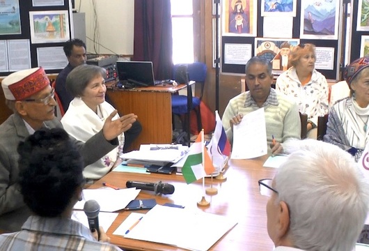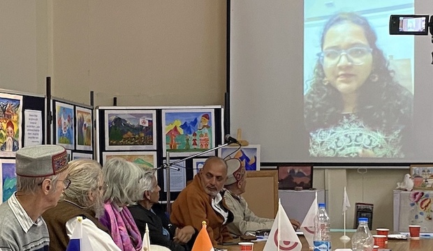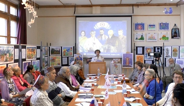 Первый докладчик, доктор Ом Кумар Шарма, почтенный основатель и руководитель школы санскрита в Кулу, в своем выступлении глубоко раскрыл связь между идеями Николая Константиновича Рериха о защите культурных ценностей и его концепцией «Мир через Культуру» — и исконными принципами индийской философии, корни которых уходят в ведийские тексты. В своей речи, украшенной рецитацией замечательных шлок и священных мантр из древних санскритских текстов, доктор Ом подчеркнул, что идея мира — шанти (Śānti) — не просто желаемое состояние, но внутренне присущий принцип, заложенный в самых ранних текстах и неотделимый от идеи дхармы. Дхарма, являющаяся одним из ключевых понятий индийской философии, часто неверно переводится как «религия». В своем глубинном смысле Дхарма означает Вселенский Закон, праведность, основополагающую природу или правильный, должный путь существования. Докладчик заметил, что лишь через культивацию личной культуры и развитие благородных качеств — таких как кшама (прощение), дама (контроль над чувствами), шауча (внутренняя и внешняя чистота) и других — человек становится сопричастен своей дхарме. Именно через следование дхарме и раскрывается путь к истинной Культуре, позволяющей обрести состояние шанти — невозмутимого покоя и гармонии. Постижение шанти и следование дхарме в контексте личной жизни делает человека способным стать осознанным звеном в эволюции всего человечества. Индивидуальное самосовершенствование, преображение сознания является, таким образом, ключом к преображению мира.