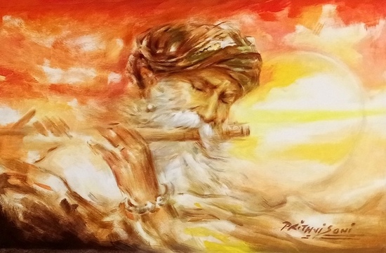 Сикандер Джангра привлек внимание присутствующих к картинам Притхви Сони, выдающегося художника из Мумбаи, одного из самых известных и уважаемых художников-дизайнеров Болливуда. В его творчестве часто встречаются сцены из сельской жизни; он славится тонкими и изящными женскими портретами на фоне романтических пейзажей, а также изображениями умудренных опытом музыкантов. Портрет девушки и образ вдохновенного старика, играющего на флейте, были представлены в экспозиции.