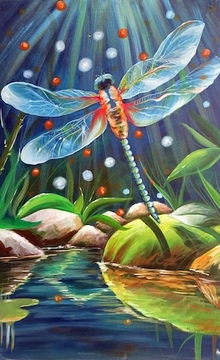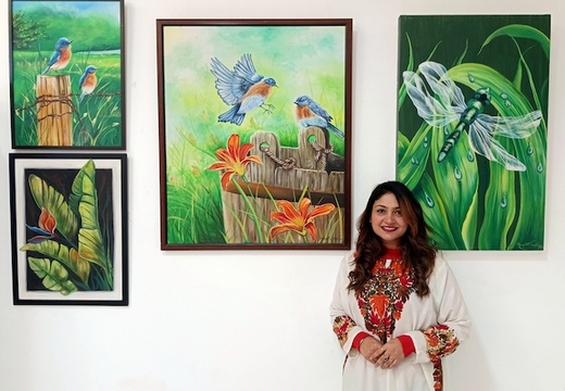 Картины Манприт Санду из Лудхианы посвящены природе, ее вдохновляющей красоте и разнообразию. На выставке можно было полюбоваться цветами, увидеть прекрасных стрекоз и ярких птиц. Манприт преимущественно использует в своем творчестве акриловые краски, они помогают ей добиться необходимых колоритных оттенков.